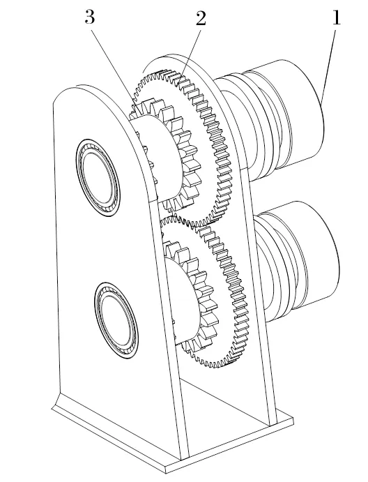在现有研究的基础上,本研究提出在连接两链轮的轴上加一对同步齿轮。这样不仅可以实现连续送绳,而且当两液压马达输出的转速不同步时,可通过同步齿轮强制将两轴转速相同,从而实现两链轮转速同步,避免钢丝绳打滑等问题。但这样会导致同步齿轮受到较大的冲击,如受到来自同步齿轮的相互挤压,或液压马达输出转矩不稳定时对齿轮的影响等,因此需要对同步齿轮进行进一步的分析。