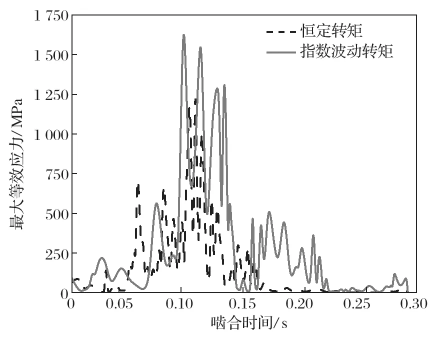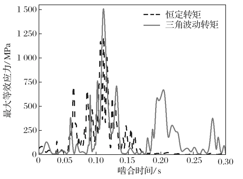 如图12所示,一次波动转矩的zui大等效应力变化趋势基本与恒定转矩的zui大等效应力变化趋势一致,同样是先增 大后减小;但是zui大等效应力幅值变大,甚至超过了材料的屈服ji限。同时,由于一次波动转矩的输出,即使位于双啮合区时,其应力波动相较于恒定转矩输出时的应力波动也是更大。