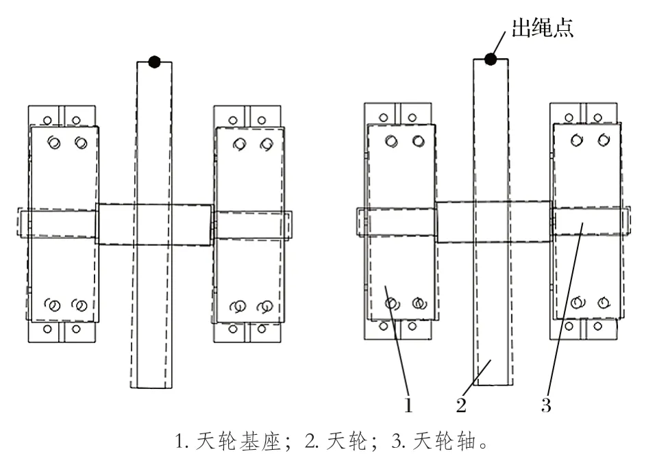 调整天轮和钢丝绳内外偏角的原则,需保证内外偏角值满足《金属非金属矿山安全规程》规定,同时还要确保出绳点位置不改变,即出绳点应维持在罐笼中 心位置的正上方,保证提升容器稳定,如图 2 所示。θ 为 1 号天轮和基座整体旋转的角度,以出绳点为原点顺时针转动;B1 和 B2 为调整之前的内外偏角,图片′为调整之后的内外偏角,2 号天轮和 1号天轮的调整方式一致,仅旋转方向为逆时针方向。