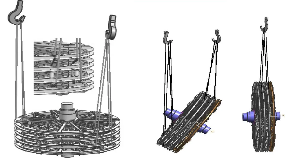 采用两根钢丝绳,主钩钢丝绳从上方腹板中一人孔穿入,绕过主轴,从同一人孔穿出。副钩钢丝绳通过工装吊盘,吊在主轴上方,起辅助调平作用。主轴两端的螺钉孔仅用于把吊具,不能直接把吊环螺钉起吊。