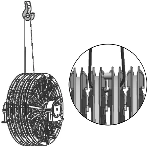 4m以下规格天轮装置:采用两根等长钢丝绳。钢绳兜吊中间两个轮子的轮缘,两根钢丝绳分别挂在同一处槽钢的左、右两侧。为防止轮子变形,两吊挂轮子之间需用千斤顶支垫。