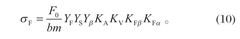 式中:YF 为齿廓系数,YF=1;YS 为应力修正系数,YS=1;KA 为使用系数,KA=1.25;KV 为动载系数,KV=1;KFβ 为螺旋分布系数,KFβ=1;KFα 为载荷分布系数,KFα=1。将各数据代入式(10),可得齿根弯曲应力为100.42MPa。
